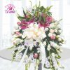 Este hermoso arreglo fúnebre, finamente elaborado en Rosas blancas – salmón, Montecasino, cartuchos blancos y demás flores de temporada, es ideal para enviar a casas funerarias y/o residencias.
