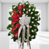 hermosa corona fúnebre finamente elaborada en Rosas rojas, blancas y crisantemos. ideal para casas funerarias y/o domicilios.